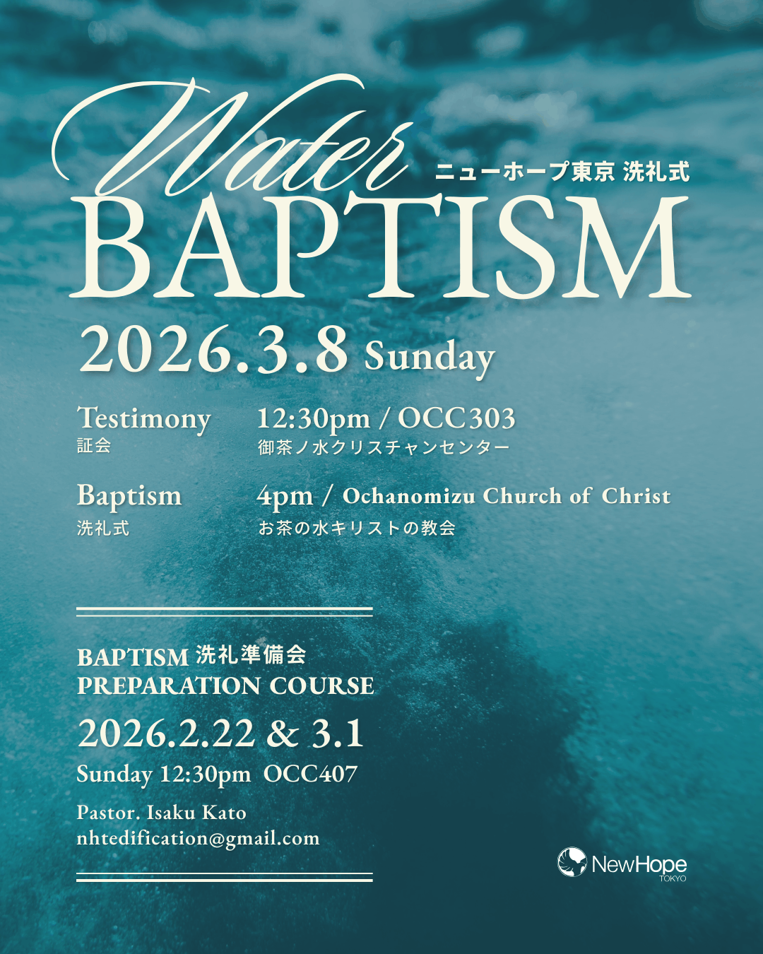 We are going to have a water baptism ceremony on Saturday, March 8th. The venue will be “Ochanomizu Church of Christ” near OCC. A baptismal preparation meeting will be held on Feb 22 and March 1st from 12:30 pm in OCC building. For applications, please contact Pastor Kato Kato at nhtedification@gmail.com.