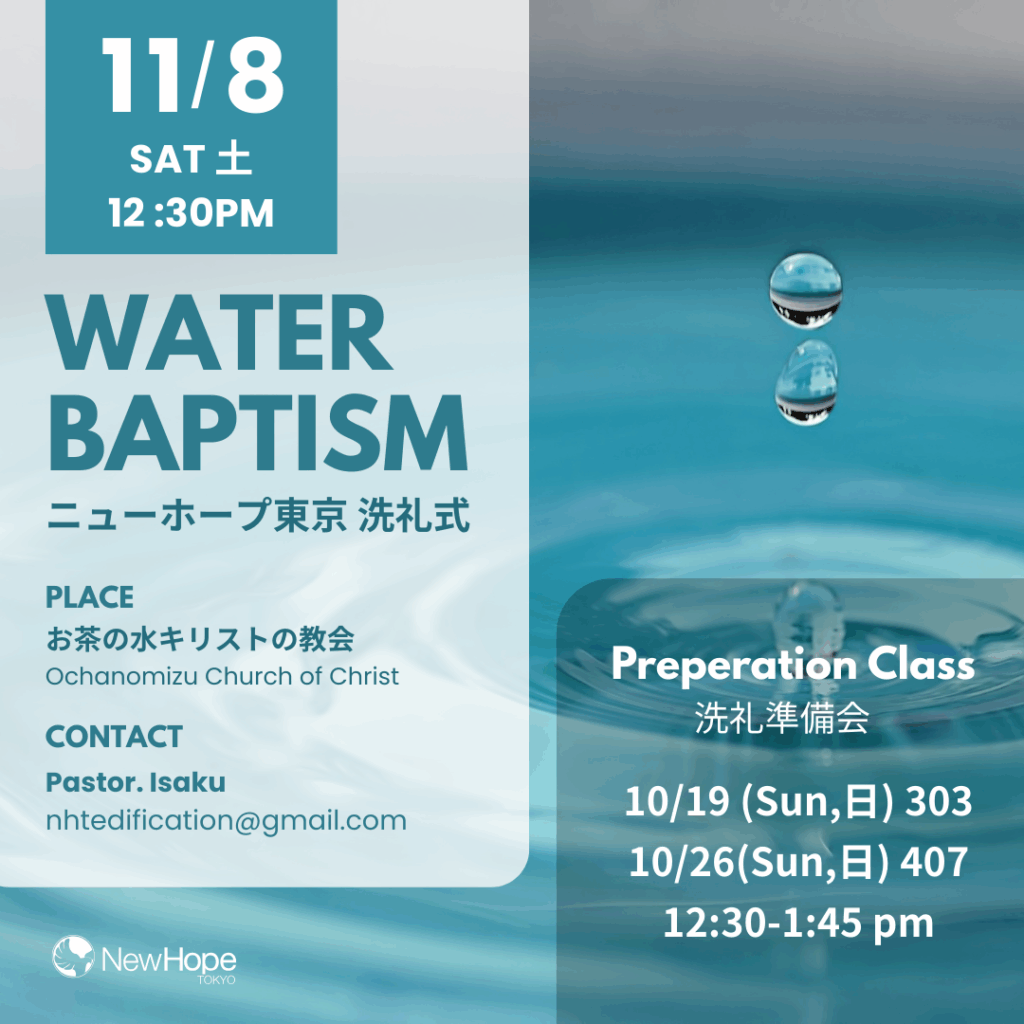 We will hold a baptism service on Saturday, November 8, at 12:30 PM at Ochanomizu Church of Christ. Let us rejoice together and celebrate this special day! For those who wish to be baptized, there will be baptism preparation classes in advance. If you would like to be baptized, please make sure to attend these classes. Please register for the baptism service and the preparation classes through the link below.